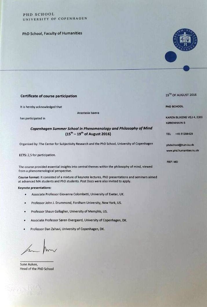 - Copenhagen Summer School in Phenomenology and Philosophy of Mind (15th - 19th of August 2016, PHD School University of Copenhagen).