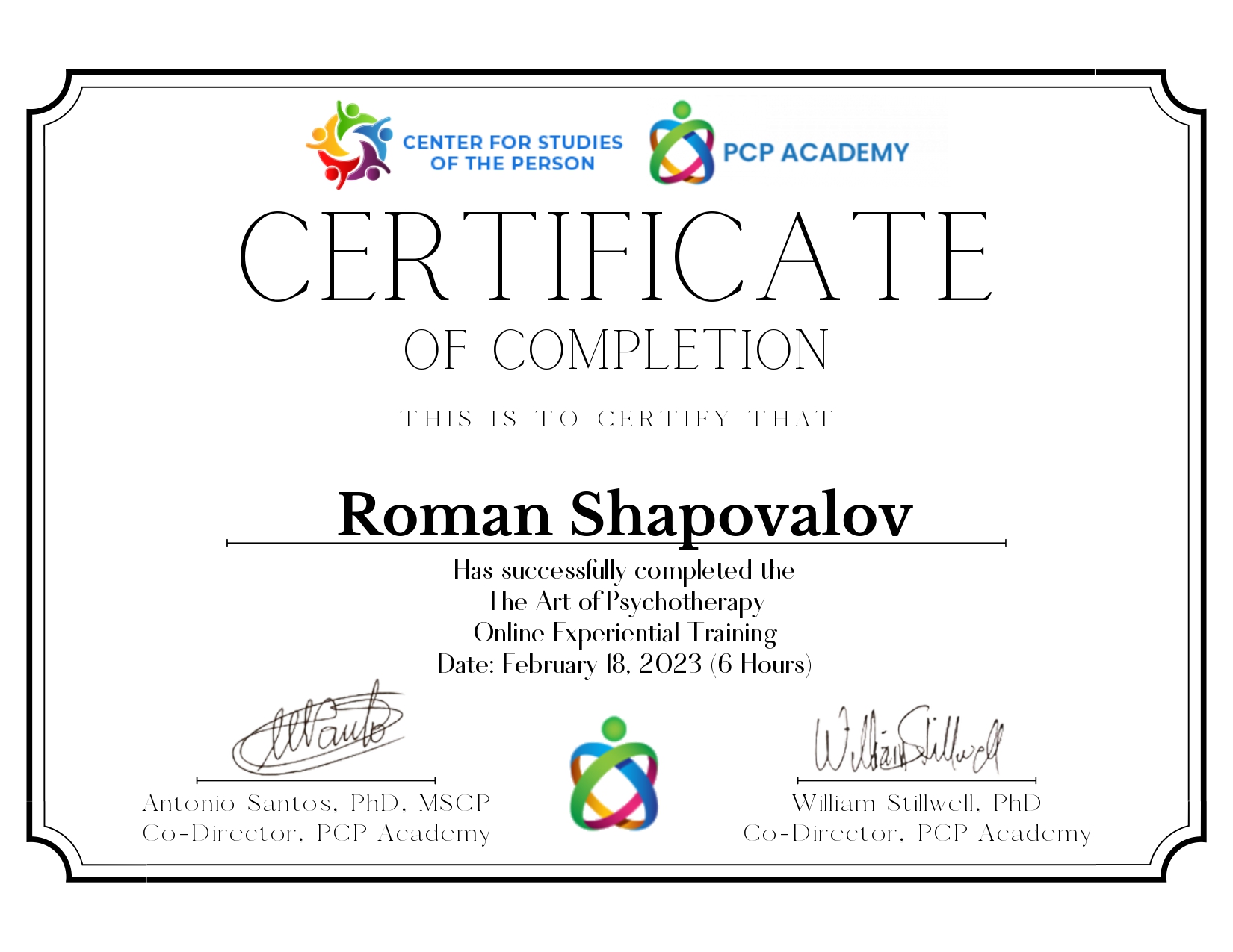 - Практический онлайн-семинар "Искусство психотерапии", Академия человекоцентрированной психотерапии, Центр изучения человека, 6 часов, США, 2023.