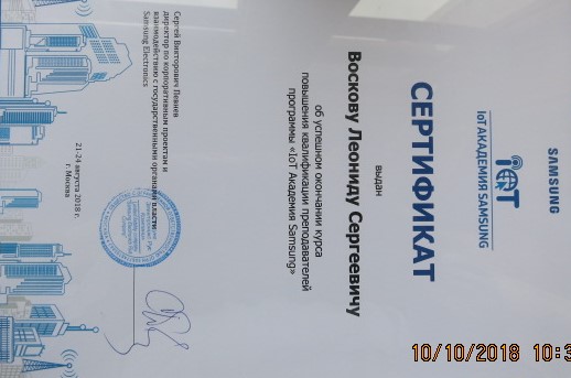 Сертификат IoT Академии Самсунг. Повышение квалификации преподавателей программы IoT Академии Самсунг, 2018 г. Сертификат